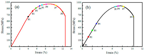 Figure 10. Transversal and longitudinal stress–strain curves and eight typical points selected. (a) Transversal curve; (b) longitudinal curve.