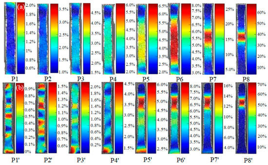 Figure 12. Cloud images of strain of transversal and longitudinal specimens. (a) Transversal specimen; (b) longitudinal specimen.