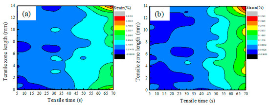 To give a further illustration of anisotropy, the strain cloud images of the transversal and longitudinal tensile specimens during the first 70 s of the experiment are shown in Figure 12. It can be seen from the differences in Figure 12b that they exhibit a nonuniform and intermittent strain distribution of the longitudinal tensile specimen because several interlayers are included, and that of the transversal specimen is relatively uniform, as shown in Figure 12a.