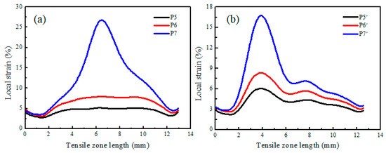 Additionally, after investigation on the initial stage of deformation, a comparison of the local strain distributed in the gauge section of the transversal and longitudinal tensile specimens is also made. Referred to as P5, P6, P7 and P5’, P6’, P7’, the results are shown in Figure 13. A high local strain region of the transversal specimen lay in the middle part and the local strain concentration reaches the maximum at P7, as shown in Figure 13a, while more than one region with a high local strain can be observed from the longitudinal specimens. With the experiment proceeding, the local strain difference increases and the local strain concentration is aggravated and reaches a peak at P7’, as shown in Figure 13b. Therefore, nonuniform local strain distribution of the longitudinal specimen is obvious, regardless of whether it is at the beginning or end of the deformation.