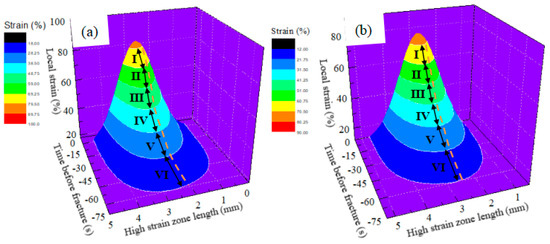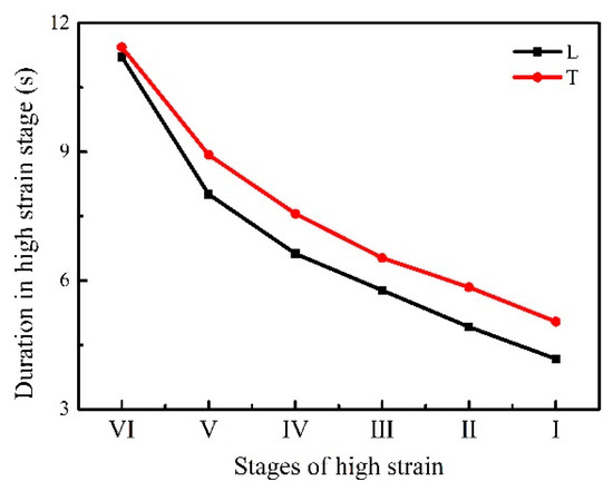 Based on the strain distribution condition, high strain zones can be divided into six high strain gradients and a comparison of the duration of high strain gradients is made to reveal the differences between the transversal and longitudinal tensile specimens. The results are shown in Figure 15. It can be seen from Figure 15, that the duration in the high strain zone (from stage I to VI) of the transversal specimen is longer than that of the longitudinal specimen. Furthermore, as high strain varied from stage VI to I (close to fracture), the duration gap between the transversal and longitudinal specimens gradually expands, suggesting that in high strain zones, the transversal specimen performed better, and the higher strain stage the tensile test experiences, the more remarkable the duration superiority of the transversal specimen.