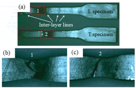 Figure 16. Macroscopic fracture appearance of tensile specimens. (a) Longitudinal and transversal specimens after fracture; (b) macroscopic fracture of longitudinal specimen; (c) macroscopic fracture of transversal specimen.