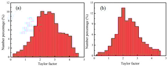 Figure 17. Comparison between the inter-layer area and deposited area on the Taylor factor: (a) Inter-layer area; (b) deposited area.