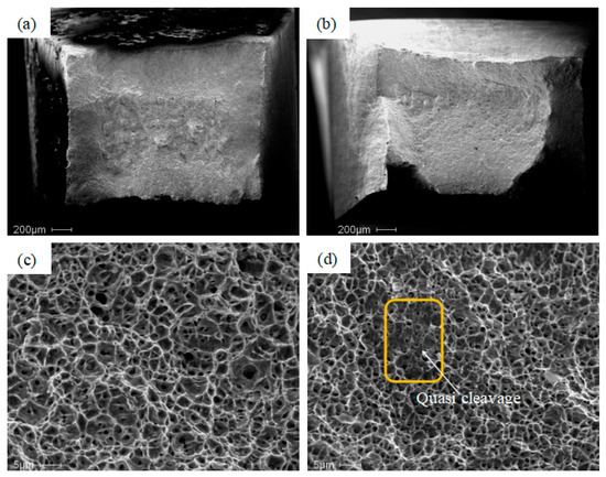 Figure 19. Fracture morphology of the tensile specimens: (a,b) Macroscopic fracture morphology of the transversal and longitudinal specimens; (c,d) typical fracture features of the transversal and longitudinal specimens.