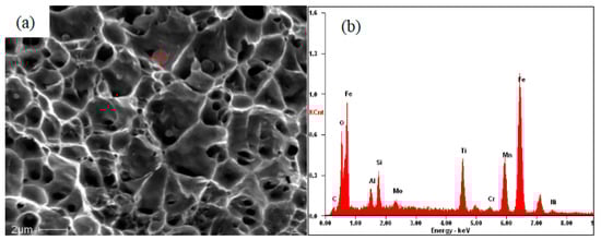 During the process of fracture analysis, a large number of uniformly distributed particles are found in the dimples, as shown in Figure 20a. The particles may be instrumental in the formation of dimples [41]. In this study, most particles are smaller than 1 μm, implying that during the process of fracture, larger stress is required for the formation of microvoids, and that the growth rate of microvoids is lower [42]. Energy dispersive X-ray spectroscopy (EDX) is applied to analyze the composition of the particles, and the results are shown in Figure 20b. It can be seen that Fe, Ti, Al, O, Mn, and Si are the main elements of the particles, which can be identified as non-metallic inclusions such as Al2O3 or Ti2O3. The existence of the particles can be considered as nucleation points for dimples.