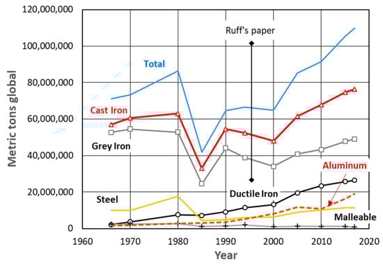 Yearly trends in global metric tonnage of casting production; reproduced from [4] with permission from American Foundry Soc, 2019.