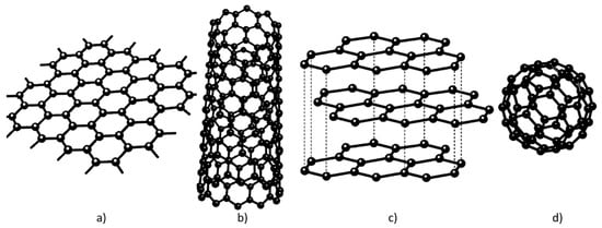Carbon can form sp-, sp2-, and sp3-hybridized bonds. Orbitals are regions around the nucleus where an electron can be found within a certain degree of probability. Hybridized bonds are mixtures between s and p orbitals. For example, in an sp3 hybridization, one s-orbital is mixed with three p orbitals to form four sp3 hybridized orbitals. Because of its ability to form hybridized bonds, carbon exists in a large number of forms to include graphite, diamond, nanotubes, fullerenes, and amorphous carbon [15]. The carbon allotropes with hexagonal lattice, include graphene, fullerene, carbon nanotube, and graphite. Thus, carbon is the unique element in the periodic table that has an allotrope in all dimensions, as shown in Figure 3. The other naturally occurring crystalline carbon, diamond, exhibits a face-centered cubic lattice above 900 °C, transforms into mono-layer graphene sheets aggregating into the layered structure typical for graphite (Figure 3c).