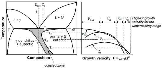 The asymmetric coupled zone for a eutectic alloy; adapted from [24,26]; the eutectic coupled zone is shown in grey.