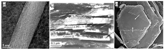 Images of graphite platelets in graphite of various origins: (a) HR-TEM image of the 002 fringes of a graphite platelet in a graphite spheroid from carbon-steel, reproduced from [28] with permission from Elsevier; (b) TEM dark field image of platelets in a graphite spherulite, reproduced from [29] with permission from Springer; (c) SEM image of growth front of new layers on platelets in a compacted graphite iron sample, reproduced from [30] with permission from Elsevier.