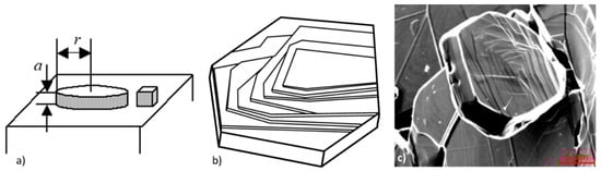Two-dimensional nucleation: (a) Schematic representation of 2-D nucleation; (b) schematic representation of sequential poly-nucleation growth of graphite nucleus; (c) thick polyhedral graphite plate in Ni-C alloy proving PNG and migration of ledges, reproduced from [31] with permission from Elsevier.
