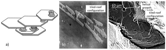 Negative wedge disclination and helical (macro-spiral) growth: (a) Schematic representation; (b) overlapping segments and hexagonal hole in metamorphic graphite, reproduced from [47] with permission from Canadian Mineralogist; (c) chunky graphite in cast iron, reproduced from [48] with permission from the American Foundry Soc.