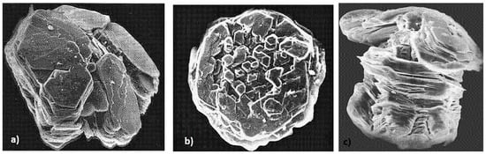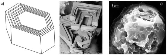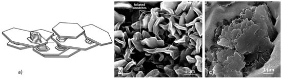Foliated crystals are assemblies of thin plates connected by thin protrusions growing perpendicular to the basal planes, and separated by solvent impurity layers, identified by Saratovkin [43] who used the concept to explain iron entrapment between graphite layers during graphite growth in cast iron. The effect of solutal driven constitutional undercooling on foliated crystal growth is explained in some detail in Reference [42]. When crystals grow parallel to one another tiled-roof configurations result (Figure 9). If the overall growth of the foliated crystal is less organized, dendritic structures are produced (Figure 10). Stacking of the crystals in the [0001] direction generates columns (Figure 11).