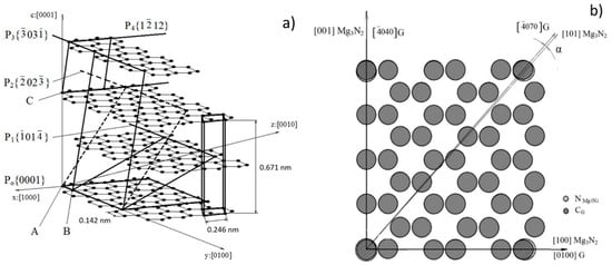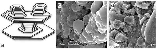 As summarized in Reference [9], in the graphite crystal, the carbon atoms are arranged in a honeycomb lattice with the distance between atoms of 0.142 nm, and distance between planes of 0.335 nm. In the plane of the layers, the tri-electronic bond of each atom with its neighbors is a strong sigma-bond (a covalent bond resulting from the formation of a molecular orbital by the end-to-end overlap of atomic orbitals; 4.19 × 105 to 5 × 105 J/mol). The fourth electron is common for the layer giving the metallic properties of graphite. Weak van der Walls molecular forces exist between the layers (4.19∙103 to 8.37∙103 J/mol), as the large axial ratio, c/a ≈ 2.7, indicates. The hexagonal graphene monolayers are stacked in an ABAB sequence. The A and B layers are displaced by half of the c-axis spacing (Figure 4a). This configuration produces the faceted morphology and high anisotropic behavior of graphite [9,23].