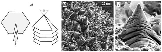 Foliated crystals in tiled-roof arrangement: (a) Schematic representation, reproduced from [42] with permission from Springer; (b) Al3Ti foliated dendrites with tiled roof configuration in Al-1.15 wt% Ti alloy; magnification ×40, reproduced from [44] with permission from Elsevier; (c) fracture area in fatigue fractured lamellar graphite iron; compliments of W.L. Guesser and the Tupy/SENAI project, reproduced from [30] with permission from Elsevier.