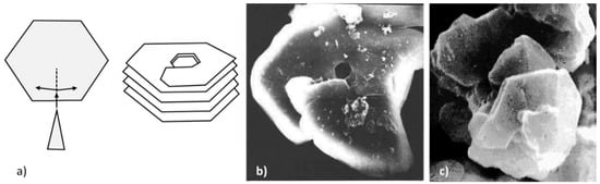 Growth of graphite in the direction: (a) Spiral growth by screw dislocation reproduced from [32]; (b) spiral growth in graphite from Ni-C alloy, reproduced from [33] with permission from Elsevier; (c) growth from the step at twist boundary, reproduced from [34].
