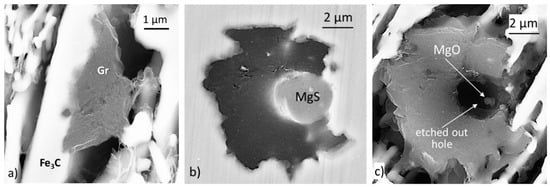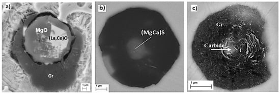 It has been thoroughly documented that MnS or complex (MnX)S compounds which have low crystallographic misfit with graphite and have a core of complex Al-Ca-Mg oxide, e.g., References [93,94,95,96,97,98] are nucleants for lamellar graphite. However, MnS was never found in the center of graphite nodules, and thus, it is not a nucleant for SG.