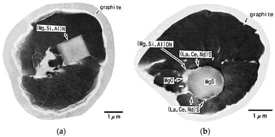 - Lalich, M.J.; Hitchings, J.R. Characterization of inclusions as nuclei for spheroidal graphite in ductile cast iron. Trans. Am. Foundry Soc. 1976, 84, 653–664. [Google Scholar]