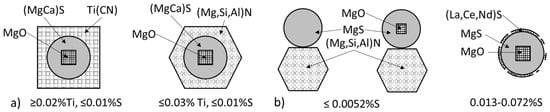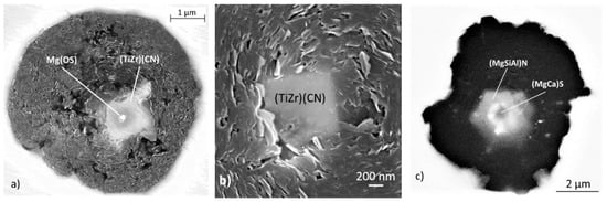 Data in Table 2 reveal that double and complex oxides have lower standard free energy, and thus, higher probability of formation, than single ones. The highest probability of formation is by far that of the complex oxide 2MgO∙2CaO∙14Al2O3 (Mg-Ca aluminate), followed by the double oxide 5CaO∙4TiO2 (Ca titanate). Calcium, aluminum and magnesium silicates also exhibit a high probability of formation. This is why single oxides are only seldom found as nuclei for SG. Indeed, a recent study on a very large number of nuclei could only find two cases of one-stage nucleation on single-compound inclusions, i.e., iron oxide and aluminum oxide [85]. However, two-stage nucleation on a nucleus with a (La,Ce)O core and an MgO shell was also observed (Figure 16a) [87].