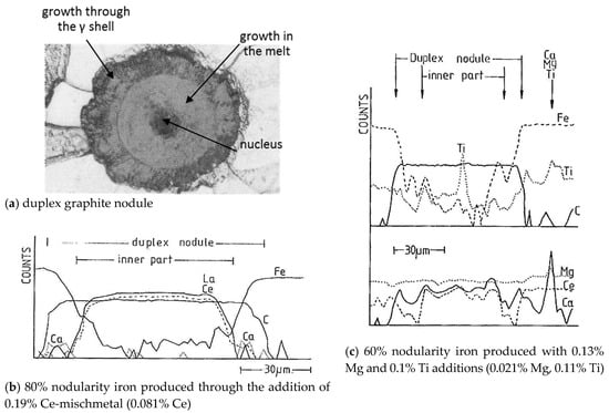Examples of spheroidal graphite (SG) nucleation: (a) Two-stage nucleation on oxides; (b) one stage nucleation on sulfide; (c) one-stage nucleation on TiC; reproduced after [87] with permission from Springer.