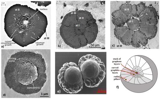 - Hamasumi, M. A newly observed pattern of imperfect graphite spherulite in nodular iron. Trans. JIM 1965, 6, 234–239. [Google Scholar] [CrossRef][Green Version]