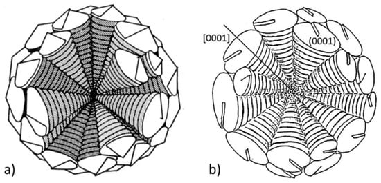 Disclinations are line defects corresponding to “adding” or “subtracting” an angle around a line. The positive wedge disclination mechanism was suggested by Amelinckx et al. [45] who argued that the initial graphite layer adopts a slitted dome-shaped configuration by introducing a fivefold carbon ring in the six-fold carbon network. Successive sheets are rotated with respect to the previous one over a constant angle, thus, producing a micro-spiral cone around a “disclination” with a fivefold carbon ring core (Figure 12a).