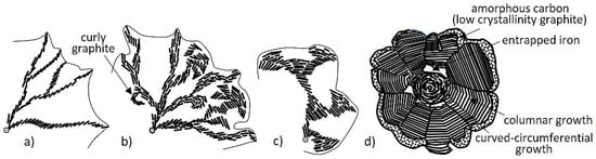 Curved-circumferential growth of graphite platelets: (a) Schematic representation [49]; (b) circumferential growth in cast iron around a (MgCa)S nucleus [50]; (c) circumferential growth in a Ni-C alloy, reproduced from [31] with permission from Elsevier.