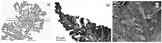 Foliated crystals growing as a dendrite: (a) Schematic representation, reproduced from [42] with permission from Springer; (b) foliated dendrites in a 0.18% Ti LG iron [30]; (c) foliated dendrites in chunky graphite, reproduced from [30] with permission from Elsevier.