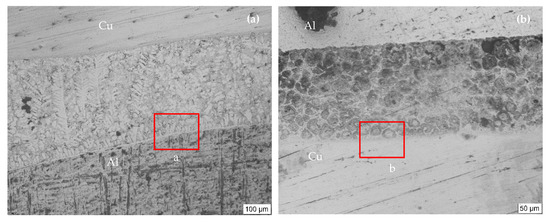 (a) brazing Al/Cu without ultrasonic; (b) semi-solid brazing Al/Cu with ultrasonic.