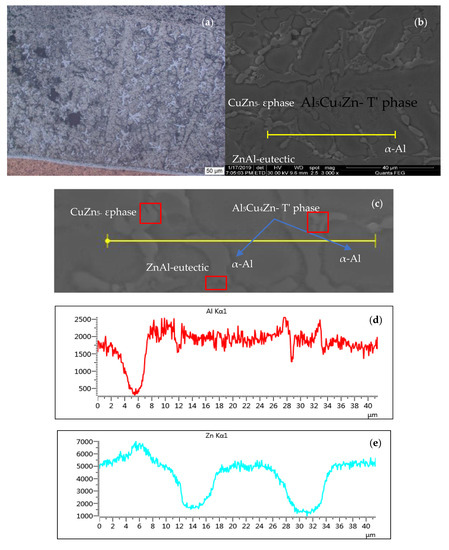 The optical microstructure of the brazed joint of common brazing samples (Figure 4a), SEM microstructure (Figure 4b) and line-scan component analysis (Figure 4c) showed that the microstructure of common brazing was mainly composed of α-Al phase dendrite and Zn-Al eutectic. The rose-like intermetallic compounds are mainly distributed at grain boundaries. According to SEM/EDS results, the following two intermetallic compounds were identified: CuZn5-ε phase (light gray zone) and Al5Cu4Zn-T’ phase (dark gray zone).