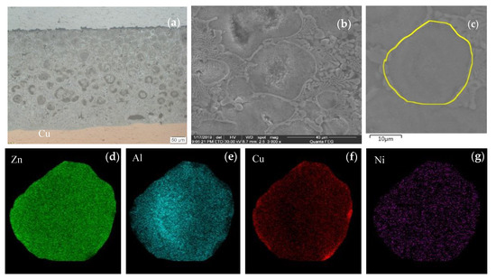 Spherulite OM morphology, SEM morphology, EDS layered image and composition distribution of ultrasonic-assisted semi-solid sample: (a) OM morphology of spherulite in the brazed joint zone; (b) SEM morphology of dendrite structure in the brazed joint zone; (c) EDS hierarchical images in spherulite; (d) Zn distribution in spherulite; (e) Al distribution in spherulite; (f) Cu distribution in spherulite; (g) Ni distribution in spherulite.