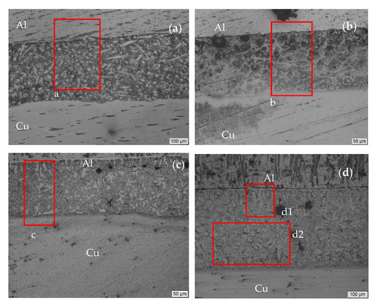Microstructure of brazed joints under different Al-substrate-side heat dissipation rate: (a) Al-side heat dissipation rate 2 K/s; (b) Al-side heat dissipation rate 5 K/s; (c) Al-side heat dissipation rate 7 K/s; (d) Al-side heat dissipation rate 9 K/s.