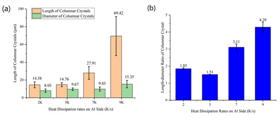 (a) columnar crystal length and diameter under four Al side heat dissipation rates (K/s) at 2 K/s, 5 K/s, 7 K/s and 9 K/s; (b) columnar crystal length-diameter ratio of Al-side heat dissipation rate (K/s) at 2 K/s, 5 K/s, 7 K/s and 9 K/s.