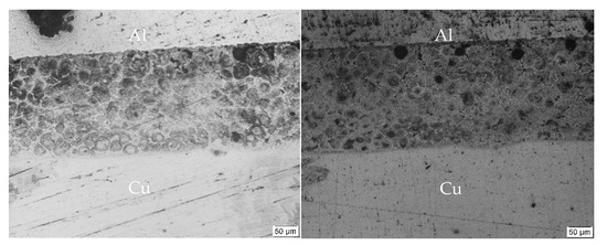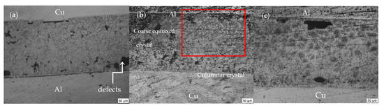 After brazing, the samples were cut off along the width and each the section was polished with a series of metallographic sandpapers. The corrosion status of each polished specimen was observed under an optical microscope (OM) (GX71, Olympus corporation, Tokyo, Japan). The corrosion method was as follows: aluminum substrate material was corroded by 2% hydrofluoric acid, and copper substrate material was corroded by 3 g of FeCl3 powder and 2 mL hydrochloric acid and 96 mL anhydrous ethanol. The corrosion time was about 5 s.