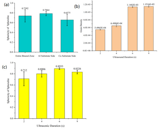In order to better characterize the effect of ultrasonic vibration on the sphericity and distribution of semi-solid spherulite of the microstructure of joints, we used image software to analyze the sphericity and spherulite density of samples with different ultrasonic vibration durations, as shown in Figure 9.