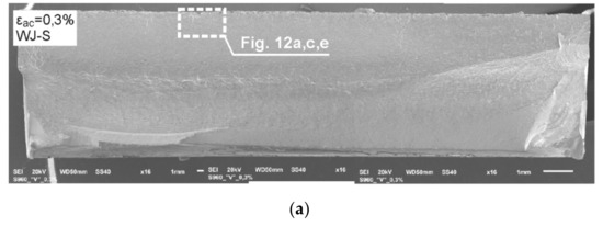 The results of the observation of fatigue fracture surfaces of the tested samples, both PM and WJ, are presented. Representative photos of PM fractures were taken on the samples tested at the load εac of 0.4% and 0.75% (Figure 9 and Figure 10). The fractographic analysis of fatigue fractures of the welded joints WJ-S and WJ-V was carried out on the samples loaded with an amplitude εac = 0.3% (shown in Figure 11 and Figure 12).