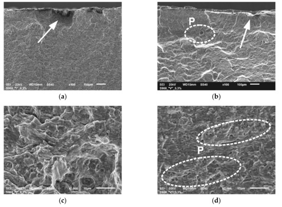 The photographs in Figure 10a,b show the site of fatigue crack initiation, while in Figure 10c,d the areas of the stable crack growth in a distance of about 0.1 mm from the initiators.