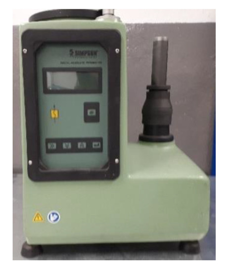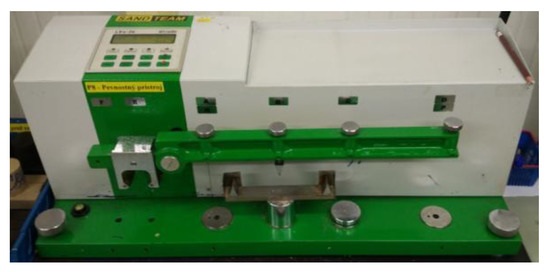The measurement of bending strength is done as a basic characteristic property for molding materials; it depends on the binder system used and its dosage, as well as on the base material used and its properties (chemical, mineralogical, grain shape, grain size). In this examination, a universal strength machine LRu-2e Multiserw Morek (MULTISERW-Morek, Brzeźnica, Poland) (Figure 4) was used. Measurement was done after 30 s (immediate strength), after 1 h (cold, final strength), and after 24 h (samples were stored in desiccator).