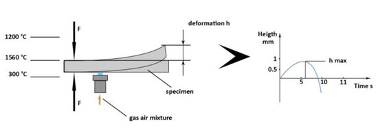 The hot distortion test was originally used to control the quality of shell molding materials. In this test, the behaviour of different molding materials from the point of view of time-dependent deformation and fracturing can be examined. The principle of the hot distortion test is shown in Figure 5. The specimen is fixed on one end and heated from the bottom at the temperature of 1000 °C. From the obtained curve (height of deformation in time), thermoplastic or brittle behavior can be evaluated [1].