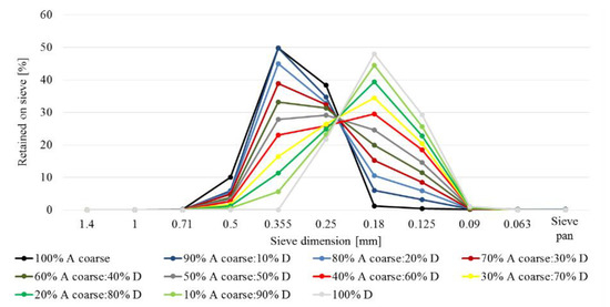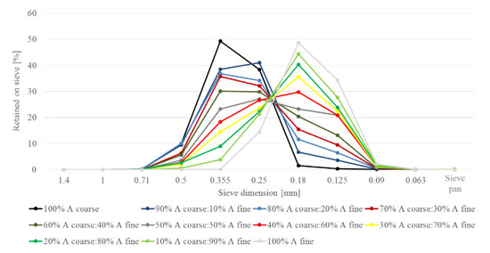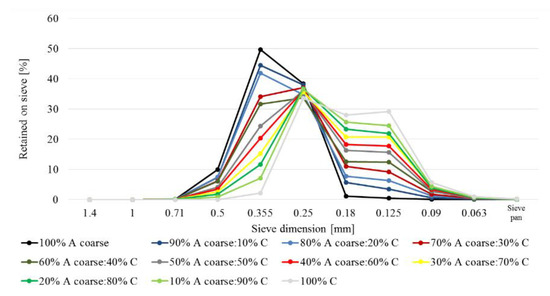 Figure 9 and Table 4 show the results from the sieve analysis for sands A coarse and C. Sand C has grain size distribution over three sieves and a very high amount on the sieve with a mesh size of 0.09 mm. This, in the case of artificial sand, is not considered as a problem from the point of view of obtained strength. Figure 10 and Table 5 present the sieve analysis results for the combination of A coarse and D. Sand D is also distributed over three sieves, but on the other hand, its fines content is around 1%, which, for foundry sands, is suitable.