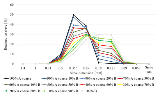The sieve analysis, as a one of the basic tests of every foundry sand, was done for each examined sand and their combinations. From the sieve analysis, basic information about sand properties can be obtained. Figure 7, Figure 8, Figure 9 and Figure 10 present the grain size distribution curves for each tested sand combination and Table 2, Table 3, Table 4 and Table 5 present the basic properties of tested sand combinations obtained or calculated from the sieve analysis. The authors have chosen the fines content as the measurement value and average grain size MK, theoretical surface Sth, and AFS GFN as the calculated characteristics.