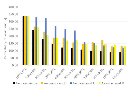 From the results of the permeability measurement (Figure 11), it can be stated that even a small addition of fine sand to coarse sand decreases the loose sand permeability by 25–40%. The permeability is steadily almost exponentially decreasing with the addition of more fine sand reaching its minimum in the pure fine sands. The biggest drop in permeability was observed when mixing A coarse with A fine. The explanation is that here, the effect of A fine as finest sand with the smallest MK value and highest fines content resulting in the lowest permeability of the chosen fine sand. One of the added fine sands shows a significant deviant behavior. When adding up to 20% of C, the permeability stays on the same high level for pure A coarse. Up to a 50:50 mix of A coarse with C, the permeability stays on a significant high level. This is noticeable especially in comparison with sand D. Both C and D are synthetic sands with an almost perfect round grain shape. C has significantly higher fines content than D and the permeability of pure C is slightly lower than that of pure D.