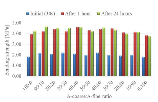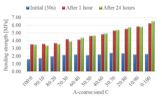 In the case of mixing A coarse and C, almost linear dependence can be seen—the more C added, the higher the strengths measured (Figure 14). Adding 20% of C leads to an increase of immediate strength by 22.5%, and 30% addition of C also increases the final strength (after 1 h) by 18.75%. The final strength of 100% C is higher by 77% compared with 100% A coarse.