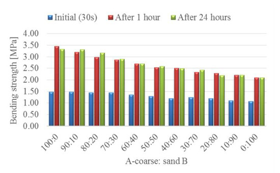 The addition of sand B to coarse A sand had a negative effect on the strength level (Figure 13). This can be explained by the angular grain shape, and the grain size distribution over three to four sieves and a high amount of dust, which confirmed the earlier prediction based on the sieve analysis.