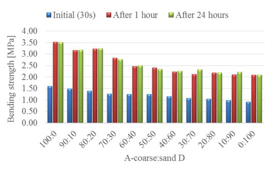 In contrast to sand C, addition of D into A coarse resulted in a linear dependence, but compared with the influence of C, it has the reverse effect—the more D added, the lower the strengths (Figure 16). This is because of the large surface of D and the high water suction capacity of grains [1,12,14]; therefore, when D is introduced to the silica sand or is used as the base material, the binder amount must be increased in order to preserve strength level needed, especially when using fine grained D AFS 65.