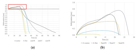 Hot-deformation curves of specimens made of tested sands: (a) general view, (b) detail.