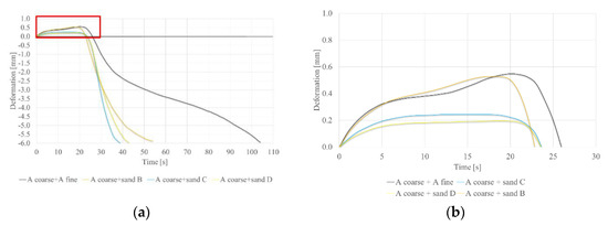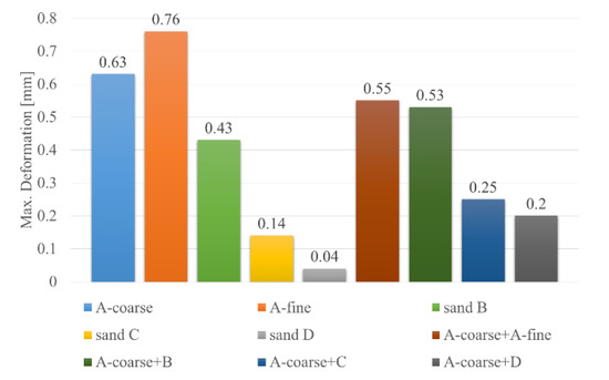 The hot distortion test was performed only for test bars made of pure sands and their 50:50 combinations. In Figure 17, there are curves obtained by the measurement of hot distortion for pure sands. From the results, a significant difference between silica and non-silica sands can be seen. D sand has almost no deformation (0.04 mm), meanwhile fine A sand has almost 20 times higher deformation (0.76 mm). This can be explained by the completely different chemical and mineralogical nature of artificial sands, resulting in lower thermal expansion. The distinct thermoplastic behavior of the cores from the A sand type is remarkable. In contrast to the other sands, which reach the maximum measurable deformation after 30 or 40 s, A fine reaches the maximum measureable deformation after 60 s, and A coarse after 82 s (Figure 17). A feasible explanation for this behavior was not found within this investigation.