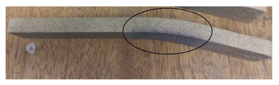 It is also important to state that, during the thermal load, test bars with alkali silicate-based binders do not break immediately after reaching the time of failure in contrast to test bars made of organic binders. This can be explained by the water glass basis of the binder systems. In contrast to organic binders, the binder bridge is not decomposing in the oxidation processes at thermal load, but when reaching its glass transition temperature, the binder becomes semi-fluid, which allows plastic deformation without breakage. Figure 20 shows deformed test samples after being exposed to thermal load.