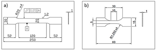 Samples for static and dynamic tests were cut, by using an abrasive jet, from the same aluminum sheet in longitudinal, transverse and diagonal direction (0°, 90°, 45°), in respect to the rolling direction. Three samples per type and direction were produced. Samples for the static tensile test were produced, Figure 1, according to the standard ISO 6892-1. These samples are flat with the following dimensions: