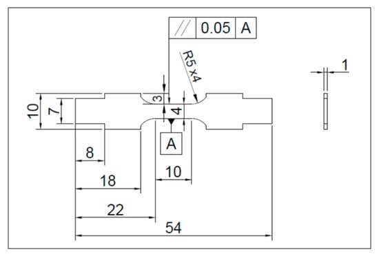 The dynamic tests were conducted with a modified Hopkinson bar (MHB) device (custom made), which requires a sample with 10 mm gauge length and 4 mm minimum width (Figure 2). These specimens were taken from sheet positions next to those of the static tests, and had the same thickness.