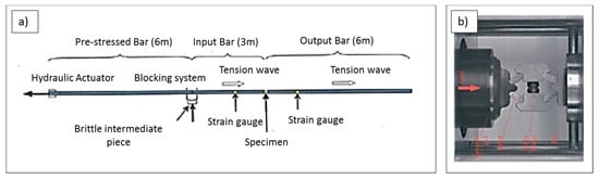 The high strain rate tests were carried out at 500 s−1 strain rate on a modified Hopkinson bar device, i.e., the tension version developed by Albertini and Montagnani in the 1970s and nowadays widely used [10,19]. The device adopted for the high strain rate tests has a total length of 15 m and its scheme is shown in Figure 3. The left-hand part of the input bar is pre-stressed by applying an increasing load, until, at a well-defined force value, the brittle intermediate piece (shown in the right box in Figure 3) breaks, the blocking system is suddenly released, and the tensile stress is rapidly applied to the right-hand side of the input bar, which is connected to the specimen.